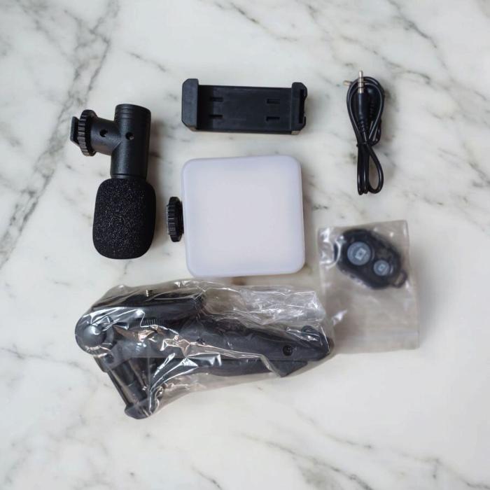 প্রয়োজনীয় আনুষাঙ্গিক: ফোন মাউন্ট সহ সামঞ্জস্যযোগ্য ডেস্ক টপ ট্রাইপড, 3টি উজ্জ্বলতা স্তর সহ রিচার্জেবল LED, যেকোনো ঠান্ডা জুতা বা 1/4” থ্রেড আনুষাঙ্গিকগুলি সামঞ্জস্য করার জন্য রেল মাউন্ট ব্র্যাকেট এবং 3.5 মিমি TRRS এবং লাইটনিং কেবল।